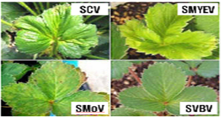 딸기에 발생하는 바이러스로는 딸기반점바이러스(SMoV), 딸기주름바이러스(SCV), 딸기황화바이러스(SMYEV), 딸기엽맥퇴록바이러스(SVBV)가 대표적인 4대 바이러스로 뽑힙니다.