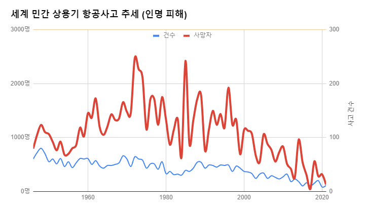 전 세계에서 민간 사용기 항공사고 추세를 알려주는 그래프가 있어, 가져왔다.